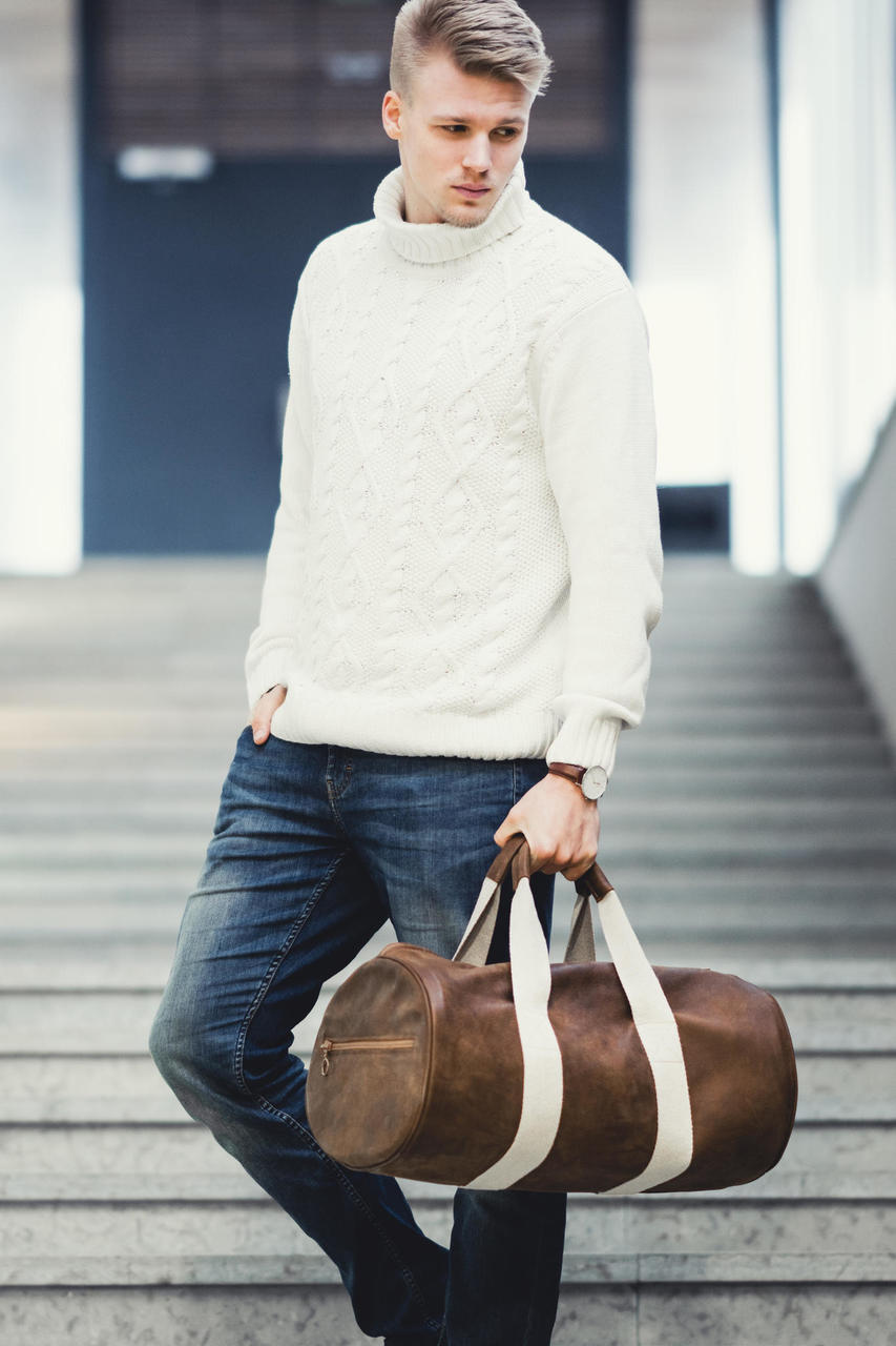 cylinder-shaped holdall bag made of genuine leather with textile handles. Bomber has the reinforced felt and soft textile lining to keep your belongings undamaged.